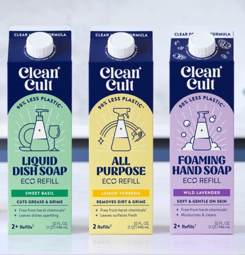 Die amerikanische Reinigungsmarke Cleancult versteht sich als nachhaltig und legt wert auf entsprechende Verpackungen. Die Produkte können in einer Glasflasche mit Spender gekauft und nachgefüllt werden. Hier setzt das Unternehmen, um möglichst viel Kunststoff zu vermeiden, auf den Getränkekarton. Die Marke versteht sich mit den Verwendern als kultige Gemeinschaft. Der bisherigen sachlichen Positionierung gelang es nicht, die beabsichtigte Anhängerschaft zu gewinnen, wie Natalie Redford, Senior Creative Strategist der mit der Neupositionierung beauftragten Designagentur Robot Food, Leeds/ Großbritannien, unterstreicht.