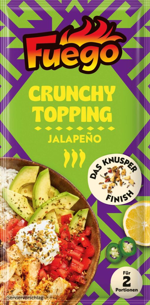 Ins zweite Halbjahr 2025 startet die Tex-Mex-Würze Fuego Crunchy Topping, eine Marke der Fuchs Gruppe, mit einem umfassenden Relaunch. Die Produkte sind vielfältig einsetzbar und verleihen Gerichten wie Salaten einen Hauch von Mexiko. Hochwertige Topshots (Fotos der Gerichte von oben), die – deutlich modernisiert – noch mehr Food-Appeal transportieren, eine moderne Typografie und die an Mexiko erinnernden Ethno-Muster sollen die emotionale Ansprache verstärken und bereits vor dem Handelsregal mexikanische Lebensfreude versprühen. Das neue Design wurde vom Fuego Marketingteam in Zusammenarbeit mit Berndt + Partner Creality, Berlin, entwickelt.