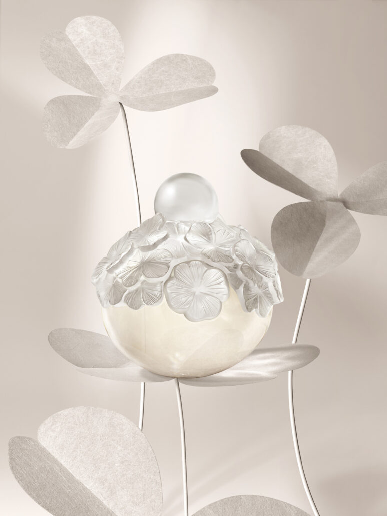 Ein Flacon, der seines gleichen sucht, ist das Ergebnis einer gemeinsamen Duftkreation des japanischen Haute-Joaillier Mikimoto und der französischen Kristallmanufaktur Lalique. Der Flacon für Fortune Leaves wurde von Laliques Artistic und Creative Director Marc Larminaux entworfen. „Ein vierblättriges Kleeblatt, das harmonisch in den Flacon eingelassen ist und sich erst beim Abheben des Verschlusses offenbart, verleiht dem Kunstwerk eine symbolische Ebene von Glück und Verheißung.“ – so die Beschreibung seitens Lalique. Im oberen Bereich legen sich zahlreiche Kleeblätter wie ein Mantel um den Glück-verheißenden Flacon. Eine runde Perle als Hommage an den Gründer von Mikimoto dient als Verschluss. Der Flacon selbst erinnert ebenfalls an eine runde Zuchtperle. Der Duft wurde von Alex Lee kreiert, einem Parfumeur von Mane, einem weltweit tätigen Unternehmen der Duft- und Aromenbranche.