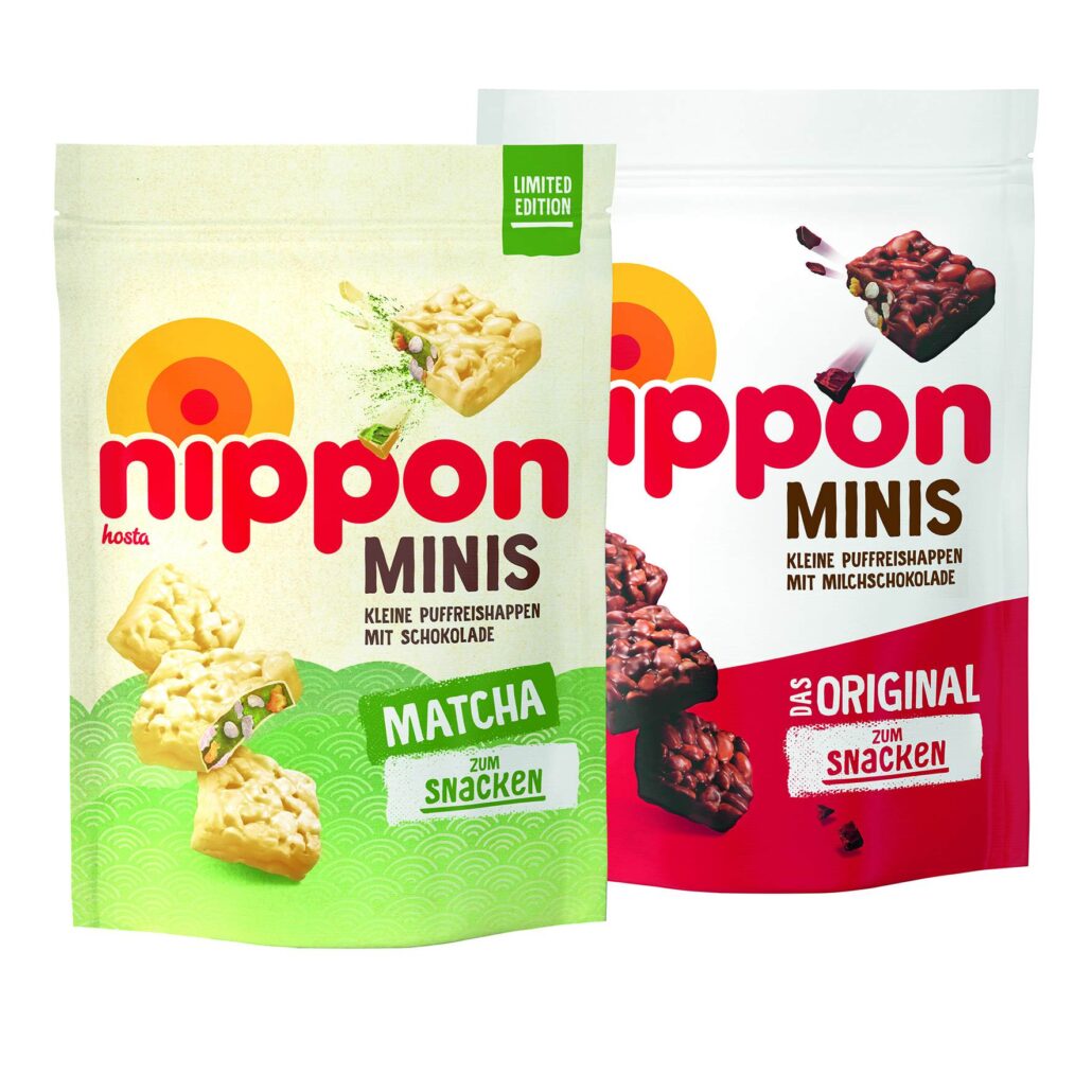 Was 2025 noch in ausgewählten Verkaufsstellen getestet wurde, das soll nun dauerhaft in die Handelsregale kommen: Nippon Minis Original von Hosta. Gleichzeitig will das Unternehmen ab Mai 2026 den Snack-Trend um die Limited Edition Nippon Minis Matcha ergänzen. Die mit Schokolade überzogenen Puffreishappen werden in OPP-Standbodenbeuteln im Kupfertiefdruck bedruckt angeboten, gestaltet von der Münchner Agentur Friedl Hampen.